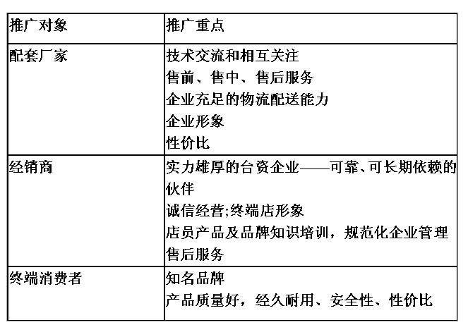 面对雨刷行业传播手段比较单一,传播停留在渠道内部,对消费者的传播比较少,装潢美容店,维修厂还有许多传播空白点的缺点。我们根据公司的整体营销策略,制定系统的宣传促销策略、计划和实施措施。对于山多力的推广宣传我们使用公关手段加广告的方法。
