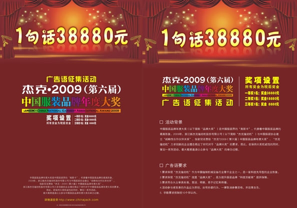 是以,南方略策划以38880元的高额奖金,向全国公开征集杰克广告语。活动为期一个月,共收到广告语作品33678条,来稿作者遍及北京、上海、浙江、河南、福建等三十多个省、直辖市。国内一些知名媒体、创意工作室和策划公司的专业人士也寄来了投稿。经过南方略项目组与杰克评审团逐一筛选,最终确定“一线科技,盛装天下”为杰克新的广告语。