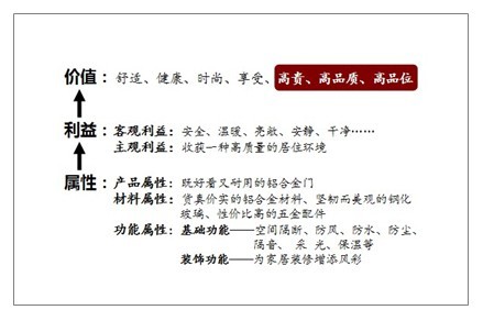 在挖掘皇派金门品牌核心价值的时候,南方略项目组的出发点并非紧紧局限于品牌的属性,而是站在行业的高度,将高端铝合金门的行业本质与皇派金门的品牌属性结合在一起,进行详细而周密的分析之后,最终得出皇派金门品牌的核心价值价值——高贵、高品质、高品位。