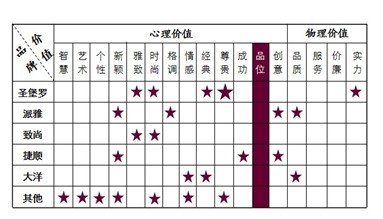 在市场走访中南方略发现,铝门产品属性同质化现象十分严重,各品牌都开始在定位上下功夫。铝门市场上能与皇派金门同台竞争的品牌不出十个,主要包括“贵族之门圣堡罗”、主张“品质、格调、创意”的派雅、“雅致、时尚”的致尚、标榜“艺术、时尚、个性”的新标以及主打情感牌的大洋等。南方略项目组经研究发现,尽管竞争品牌定位诉求概念众多,其中有些品牌所提及的价值诉求过多,且与竞争对手出现“撞衫”现象;然而,仍有一些比较典型的价值要素(比如“品位”)尚未满足消费者的心理需求,这就给皇派金门品牌定位留下了足够的空间。庆幸的是,“品位”恰好与皇派金门品牌核心价值不谋而合。