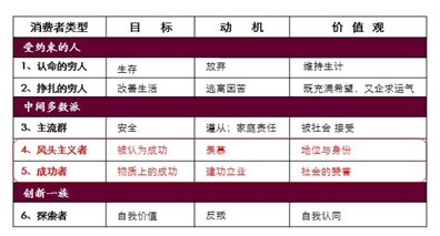 在消费者分析中,南方略发现皇派金门的消费者主要包括两大人群:风头主义者和成功者。这两类人群显性的差异表现在收入的差距,而隐性的差异则表现在各自不同的价值观和消费形态上。