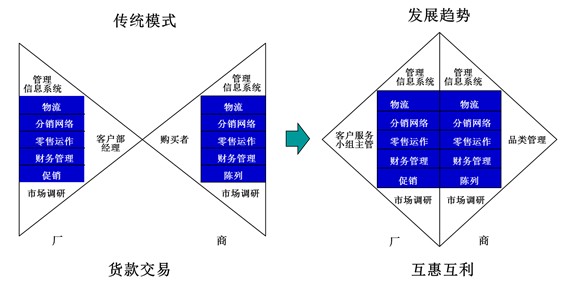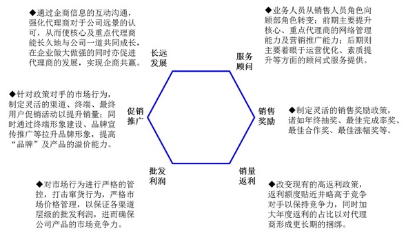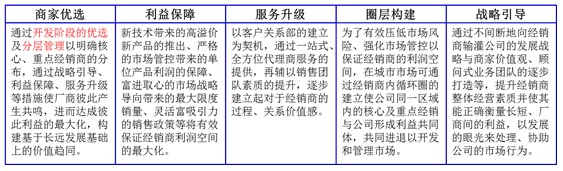 通过厂商互补以开发维护市场:以核心、重点经销商为主要对象,市场开发与维护逐步实现由经销商单干的放羊式销售向经销商为主、公司人员协助的协销模式发展,最终发展为厂商共同开发维护市场的联合式分销模式。