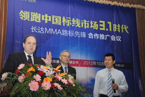 长达MMA双组份路标先锋采用高品质的DEGAROUTE?甲基丙烯酸酯类的活性树脂作为基料。具备出色的耐用性;高交通流量下保持外形稳定 - 热稳定性好:耐高温耐寒,有效防止铲雪车的刮铲;与路面附着力出色,并具有相当柔韧性与路面变形相匹配;与反射玻璃珠间的化学键接强;常温固化,环保性能出众符合国际标准等特点。