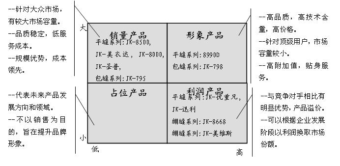 根据杰克目前在产品方面的资源及营销战略对杰克的产品进行了规划。首先将杰克的产品划分三大类:平缝机、包缝机、绷缝机。平缝机主要局限在中低端产品,而且以低端产品为多,该类别竞争激烈,利润较低;同时,杰克在同档次产品的市场占有率中没有明显的优势,特别是中档产品的销量远低与直接的竞争对手。杰包缝机产品主要局限在中低端产品,但795的销量较大,并有较好的市场口碑;JK798显示了杰克在包缝机领域的技术国内领先的地位,包缝机是杰克的优势产品,杰克必须通过技术优势和价格优势,在中高端扩大市场份额,适当调整788的价格,促使其销量增加,以销量促进品牌知名度,同时加强市场推广,目标是做到包缝机第一国内品牌,并树立相应的品牌形象。杰克在绷缝机方面因为市场销量有限,优势不能被有效放大,因此在该品类里不明显。