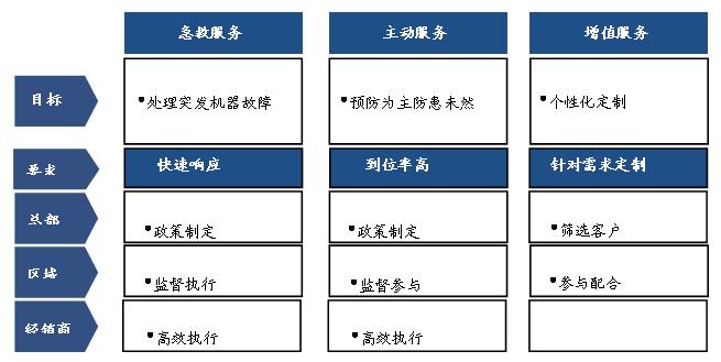 树立全员服务思想,调动销售服务等各职能人员积极性,转变“服务即维修”的观念,作好售前、售中以及售后服务。经销商是服务提供者,杰克需要通过明确利益, 分清责任, 整合资源、建立管理统一化、行为规范化、过程流程化、流程制度化的三位一体的服务体系将其应纳入公司的服务体系,保证服务质量,提高服务规范性和一致性。完善整机档案,整合用户资料、维修记录等信息,为服务各环节提供统一平台,减少差错率。总部、区域和经销商分工协作,打造“急救服务+主动服务+增值服务”的3+服务模式。
