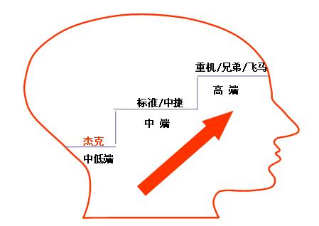 杰克目前还只是一个具有一定知名度的品牌,且主要服务于中低端市场,而且由于对品牌关注度低和品牌推广能力有限,品牌形象一般,但是杰克产品的性价比要高于竞争对手,且网络覆盖区域比较广。南方略项目组认为其近期目标应该从具有一定的知名度向全国性领导品牌迈进,其远期目标则是成为在全球具有一定竞争力的国际化品牌。