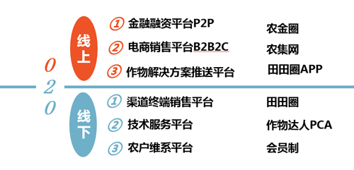 田田圈整体上分为线上和线下两块,线上拥有金融平台农金圈,电商平台农集网和解决方案平台APP,线下分为终端实体零售店田田圈服务中心,种植达人和会员制度。利用互联网的线上传播优势把吸引用户的实用有效信息和服务支持项目通过网络传达给互联网农户,吸引农户到线下实体终端店去体验和消费,做到把线上和线下贯通,业务支撑。