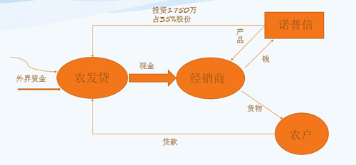 金融是经济发展的血液,针对此,田田圈提供了针对性的支撑型平台----融资平台农金圈。2015年3月19号,诺普信农化股份有限公司与深圳农金圈金融服务有限公司在深圳签订了《深圳农金圈金融服务有限公司增资协议》,诺普信公司将以自有资金1750万元参股农金圈获其35%股份,并通过农金圈公司的农发贷互联网金融平台募集资金,通过众筹、风投等方式,将募集的资金以P2P形式直接借款给农户,并且将自己的产品通过经销商卖给农户,同时解决了农户采购需求和资金困扰,还提高了自己的销售,提高了客户对公司的黏性。我画了一张图来帮助更直观地弄清楚明白到底是怎么运作的。